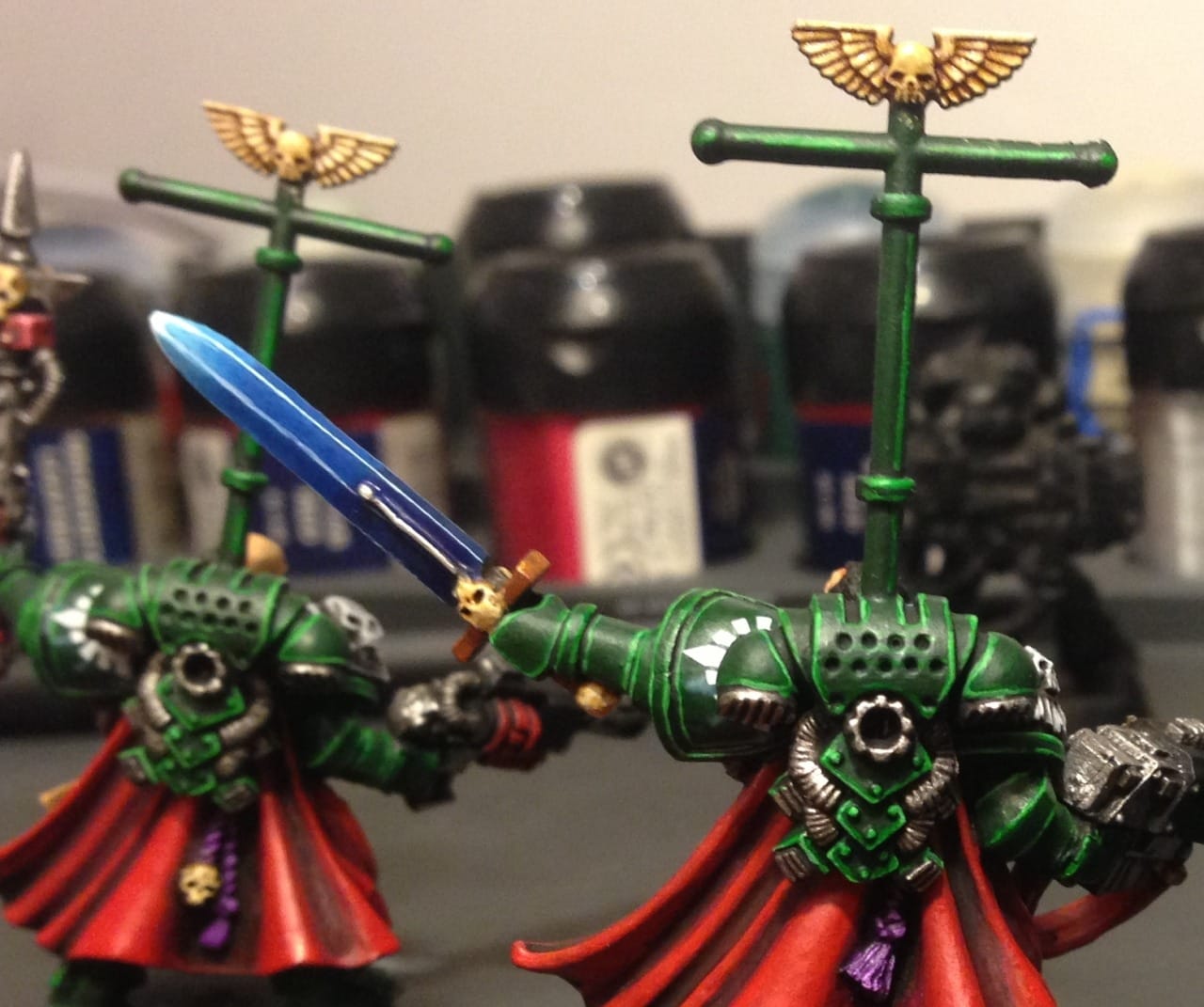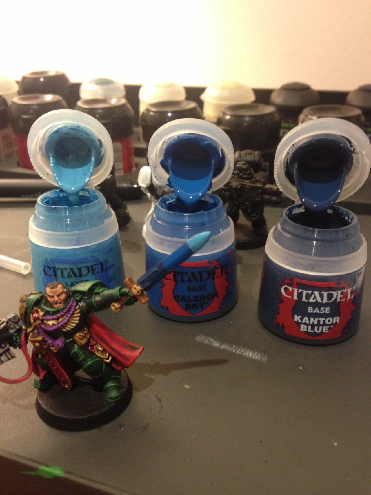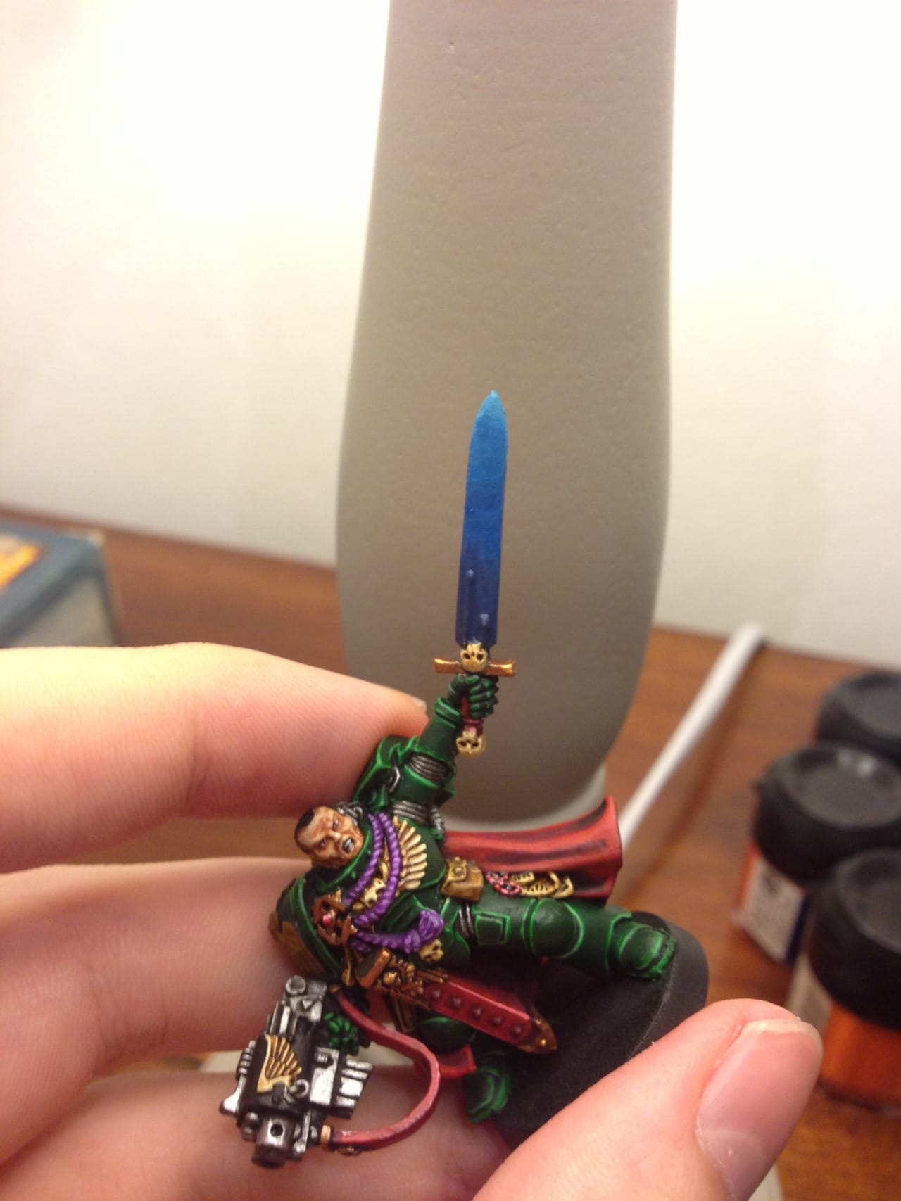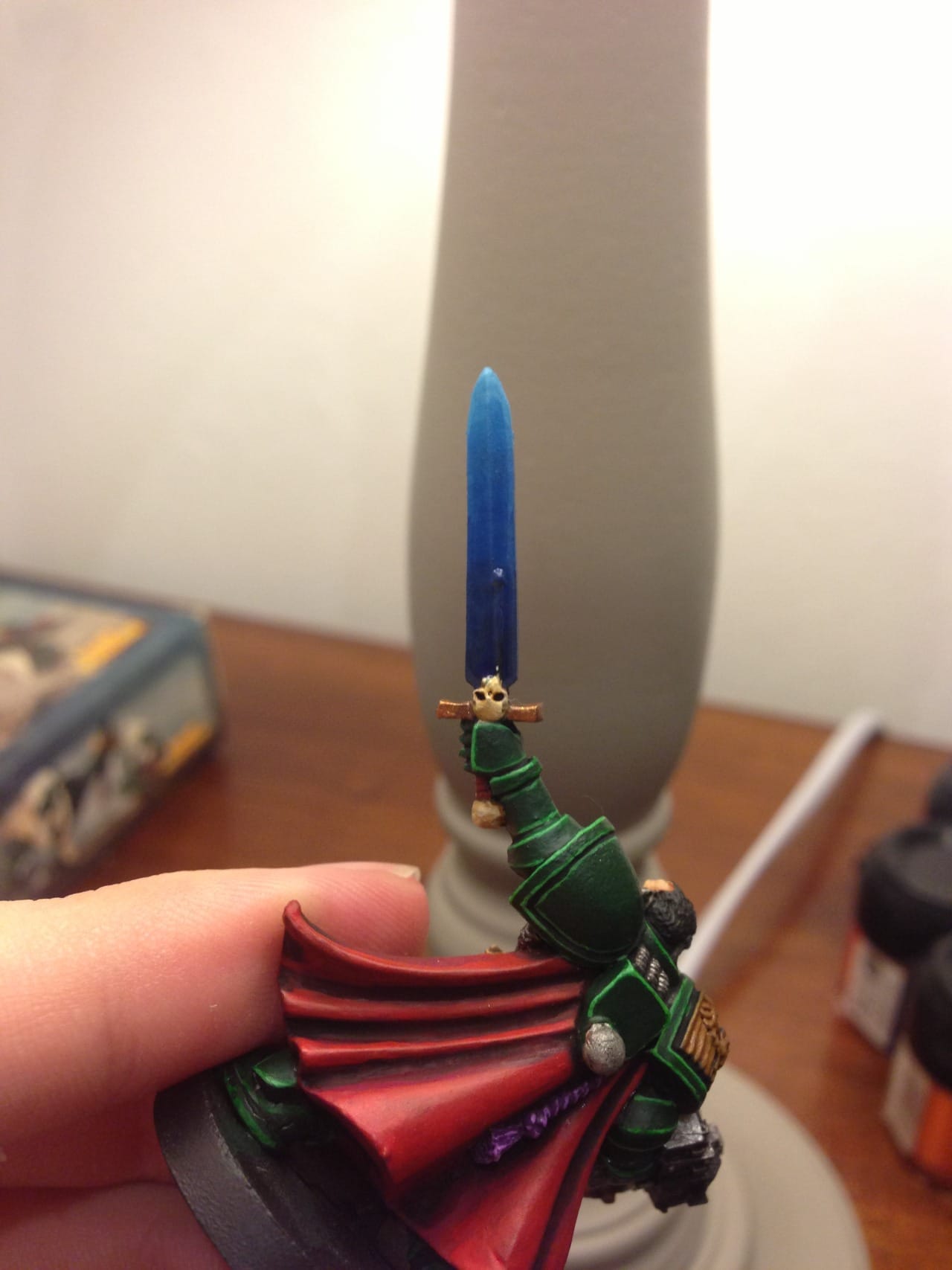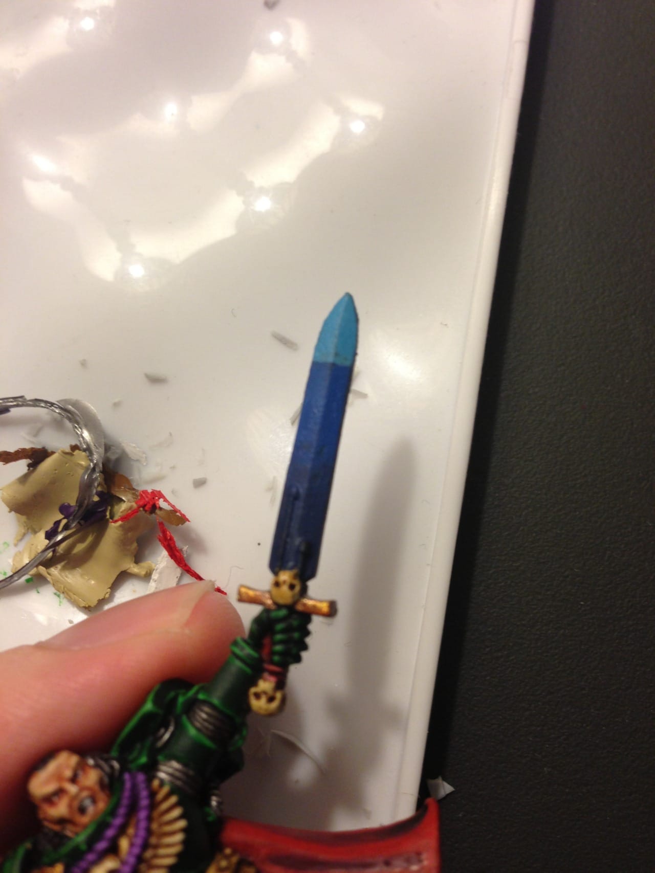 - Step 7 (optional): Glaze - Particularly when you are new to this, a glaze can really help to smooth the transitions of your blending. I used the citadel guilliman blue glaze. Draw the glaze from the tip of the blade to the hilt in smooth strokes. You want a thin and even layer, dont allow the glaze to pool anywhere.